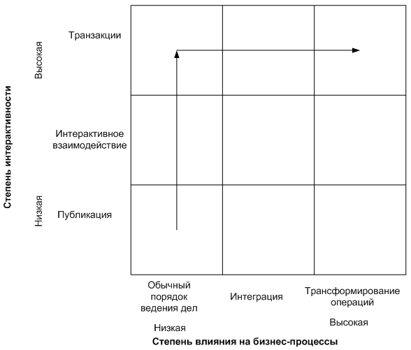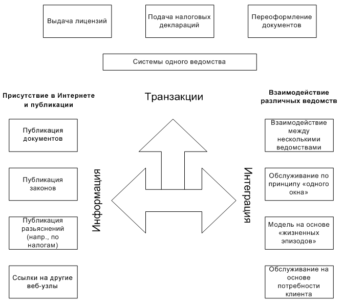 Потенциальный путь развития электронного правительства – от публикации информации через организацию интерактивного взаимодействия к электронным транзакциям – ведет к интеграции государственных услуг и трансформированию работы государственных органов на всех уровнях, к реализации административной реформы.