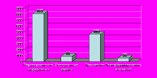 исунок 4 демонстрирует распределение инициатив в области электронного правительства по категориям на примере программ, реализуемых в 37 различных федеральных ведомствах США (данные за 2002 год). Из приведенного здесь рисунка видно, что даже в такой передовой стране, как США, – являющейся одним из мировых лидеров в области использования информационных технологий в государственных учреждениях – большинство услуг являются информационными. Но в то же время там уже реализовано определенное число проектов, которые предполагают выполнение реальных операций полностью от начала и до конца на основе использования электронных каналов предоставления услуг.
