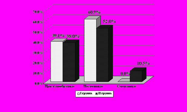 У большинства пациентов I группы боли были постоянными (60,9% по сравнению с 52,0% во II группе), а смешанные боли были отмечены нами только у пациентов с АД (Рис. 2).