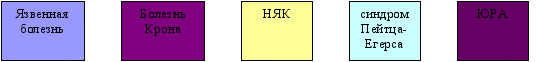 ети с желудочно-кишечными кровотечениями наблюдались с диагнозами: язвенная болезнь двенадцатиперстной кишки (5 детей), болезнь Крона – 8 детей, неспецифический язвенный колит – 4, синдром Пейтца-Егерса – 3, ювенильный ревматоидный артрит – 2 ребенка.