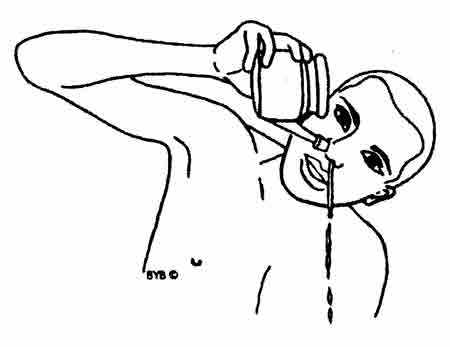Наполните сосуд для нети приготовленной соленой водой. Возьмите сосуд одной рукой, как показано на рисунке. Наклоните голову в сторону и слегка назад. Начните дышать ртом.