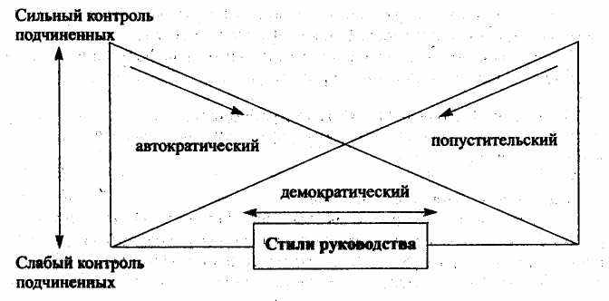 Различают три основных типа стилей руководства (К.Левин): демократический (коллегиальный); авторитарный (директивный, единоличный); либеральный (попустительствующий, анархический, пассивный) (рис.2.11).