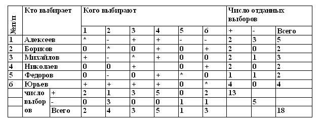 Анализ социометрического пороса ведется раздельно по формальному и по неформальному критериям. Результаты опроса заносятся в социоматрицы (см. табл. 1), представляющие собой таблицу с размещенными в ней ответами каждого из членов группы.