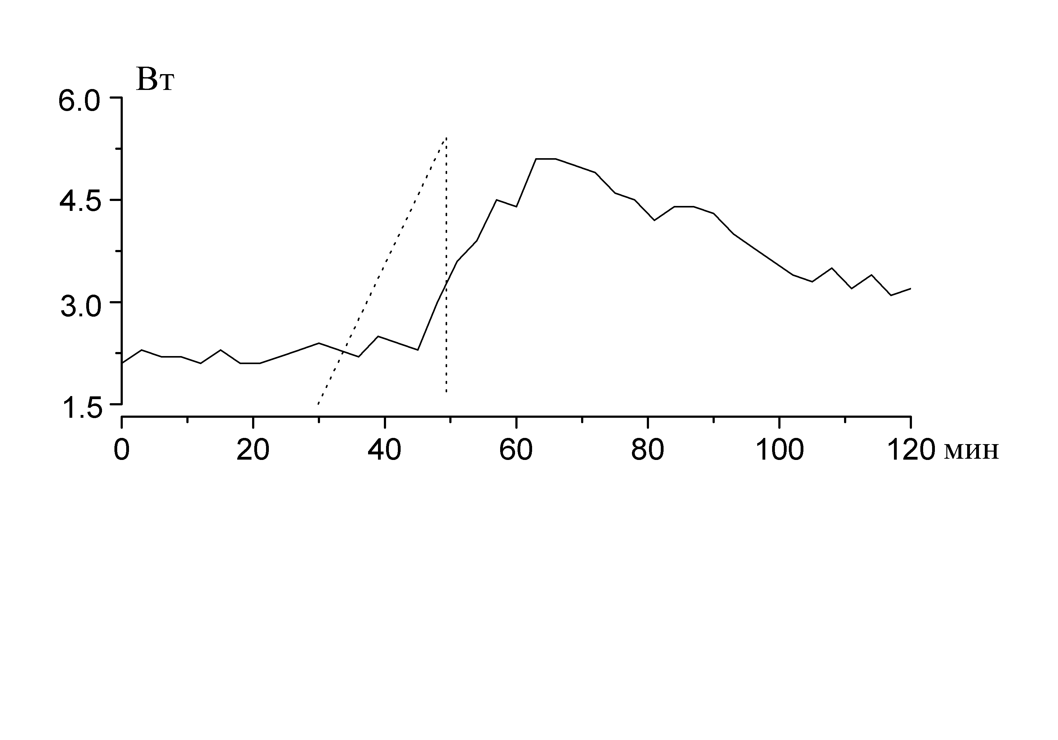 Рис. 6. Изменение теплоотдачи скоплением, содержавшим около 4,5 тыс. пчел под влиянием введения в него 2328 Дж (556 кал) тепла (продолжительность включения термода и развиваемая им мощность показаны пунктирной линией)