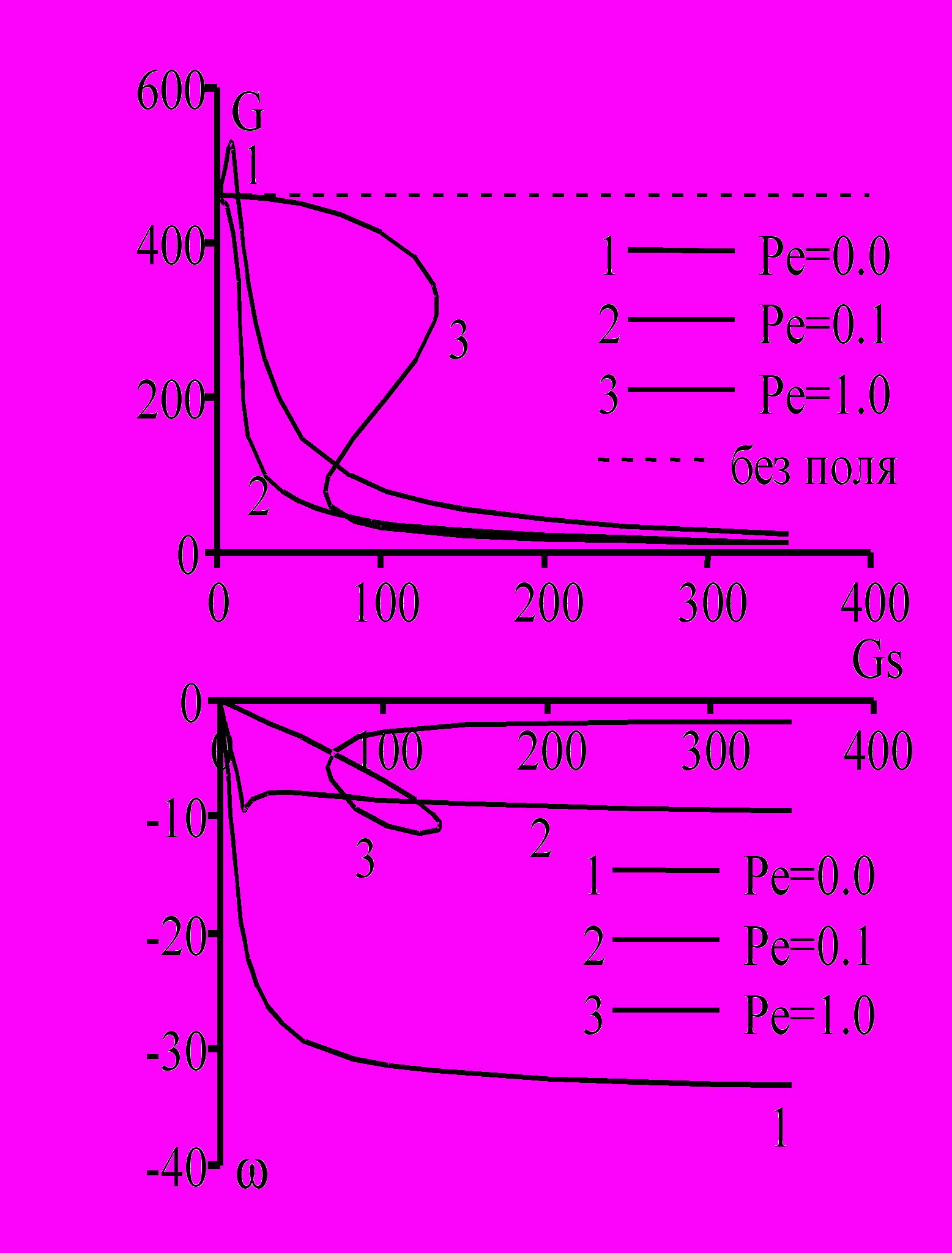 Для изучения были выбраны различные комбинации чисел Прандтля P = и Pe = /0h2, позволяющие устанавливать произвольные соотношения для времен релаксации скорости, температуры и заряда. На рис. 10 представлен случай P = 0,1, когда характерное гидродинамическое время (время релаксации скорости) много больше характерного теплового времени (времени релаксации температуры); такие возмущения условно считают "изотермическими". Штриховая линия показывает критическое число Грасгофа в отсутствии электрического поля. При Pe = 0 (кривая 1, случай, когда характерное тепловое время много больше времени релаксации заряда), с ростом Gs поначалу наблюдается стабилизация стационарного течения, сменяющаяся затем дестабилизацией при больших значениях Gs.