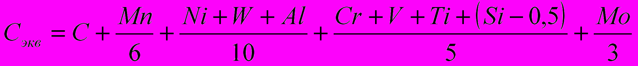, в основе которого лежит влияние легирующих элементов на коэффициент теплопроводности стали, причем, это соотношение рекомендуется применять для сталей, максимальное содержание элементов в которых не превышает 0,9 % С; 1,1 % Mn; 1,8 % Si; 1,8 % Cr; 5,0 % Ni; 0,5 % Mo; 2,0 % W; 0,25 % V; 0,5 % Ti; 2,0 % Al. В соответствии с последним соотношением стали разделяют на 5 групп: 1 и 5 – наименее и наиболее чувствительная (Сэкв < 0,55 и Сэкв > 1,3); 2,3 и 4 соответственно имеют Сэкв = 0,55 – 0,75; 0,75 – 0,90 и Сэкв = 0,9 – 1,2.