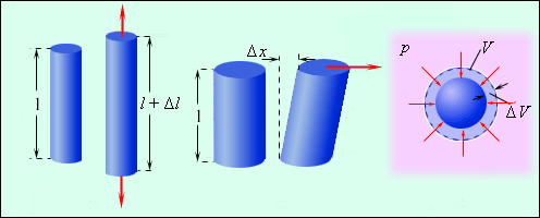 | Некоторые виды деформаций твердых тел: 1 – деформация растяжения; 2 – деформация сдвига; 3 – деформация всестороннего сжатия |
