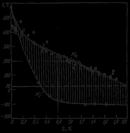 . Мартенситне перетворення відбувається тільки при безперервному охолодженні. Для кожної сталі починається й закінчується при певній температурі, незалежно від швидкості охолодження. Температуру початку мартенситного перетворення називають мартенситною крапкою МН, а температуру закінчення перетворення – МК. Температури МН і МК залежать від змісту вуглецю й не залежать від швидкості охолодження Для сталей зі змістом вуглецю вище 0,6 % МК іде в область негативних температур (мал.)Залежність температур початку (МН) і