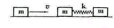16*. На покоющуюся на гладкой горизонтальной поверхности систему из двух тел массой m каждое и соединенных пружиной, со скоростью V налетает тело такой же массы m. Удар абсолютно упругий. Найти максимальное растяжение пружины. Жесткость пружины k.