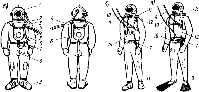 а- вентилируемое трехболтовое; б- легководолазное с подачей воздуха по шлангу для работ с твердой опоры; в- то же для плавания под водой; 1- шлем; 2- плечевой брас; 3- водолазная рубаха; 4- шланг; 5- кабель-сигнал; 6 -передний и задний грузы; 7 -пояс; 8- нижний брас; 9- галоши; 10 -сигнальный конец; 11- дыхательный аппарат; 12 -гидрокомбинезон; 13- легководолазные боты; 14 -нагрудный груз массой 15 кг; 15- ласты; 16- грузовой ремень массой 10 кг с быстроразмыкающейся пряжкой