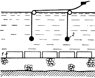 1- первый курс массивовой кладки; 2- подвешенные в воде на буйках или на специальной раме группы зарядов