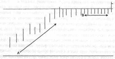 ется, и цена начинает первые шаги вниз, что на рисунке 4.14 обозна-
