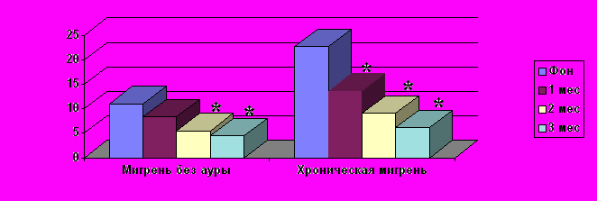 На фоне лечения в группе МбезА снижалось число дней с ГБ в месяц с 11,02,5 до 8,43,7 (p<0,05) в 1-ый месяц, до 5,53,5 (p<0,001) во 2-ой и до 4,53,5 (p<0,001) в 3-й месяцы лечения. Число респондеров составило 56,2% (18 пациентов). Уменьшалась частота приступов, начиная с 8,41,8 до 5,62,8 (p<0,05) в 1-ый, до 4,41,9 (p<0,01) во 2-ой и до 3,62,6 (p<0,01) в 3-й месяцы.