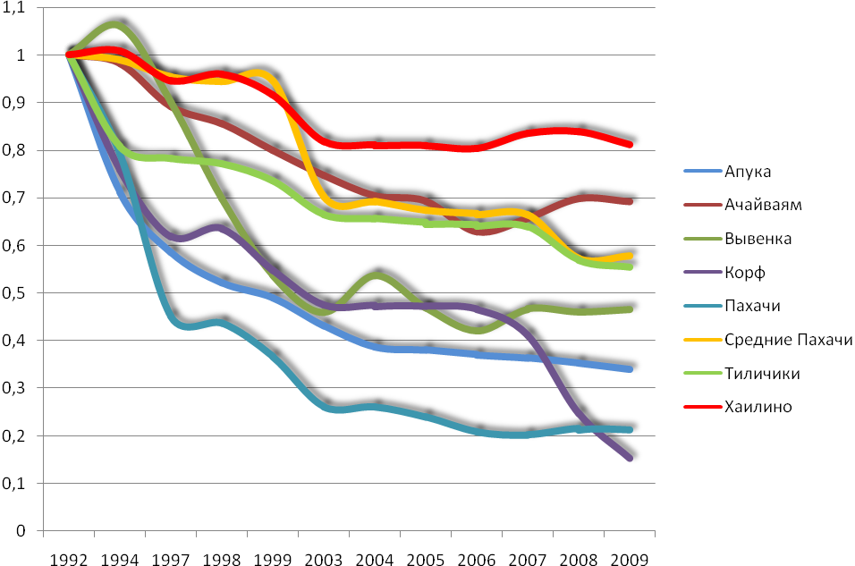 Рис. 4.3 Численность населения сельских поселений Олюторского района в 1992-2009 гг., в разах от 1992 г. (1992 г. = 1)5