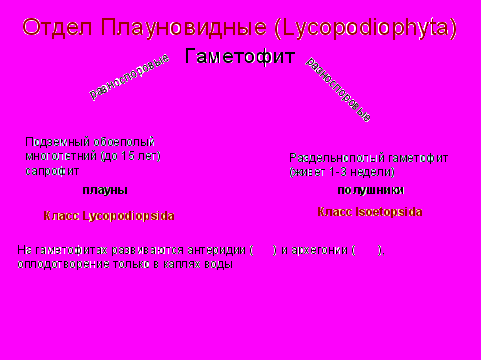- Гаметофиты зеленые, наземные, обоеполые, живут несколько лет, не отмирают после развития спорофита.