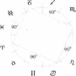 А если на этот факт посмотреть через призму астрологии (в этот момент над сценой засветился экран с рисунком), то мы увидим, что этим цифрам соответствует напряжённый кармический (90°) аспект Щ - квадрат и творческий аспект (120°) -трин. Аспекты рассказывают, как планеты разговаривают между собой и к чему это может привести. Всё это подобно жизни