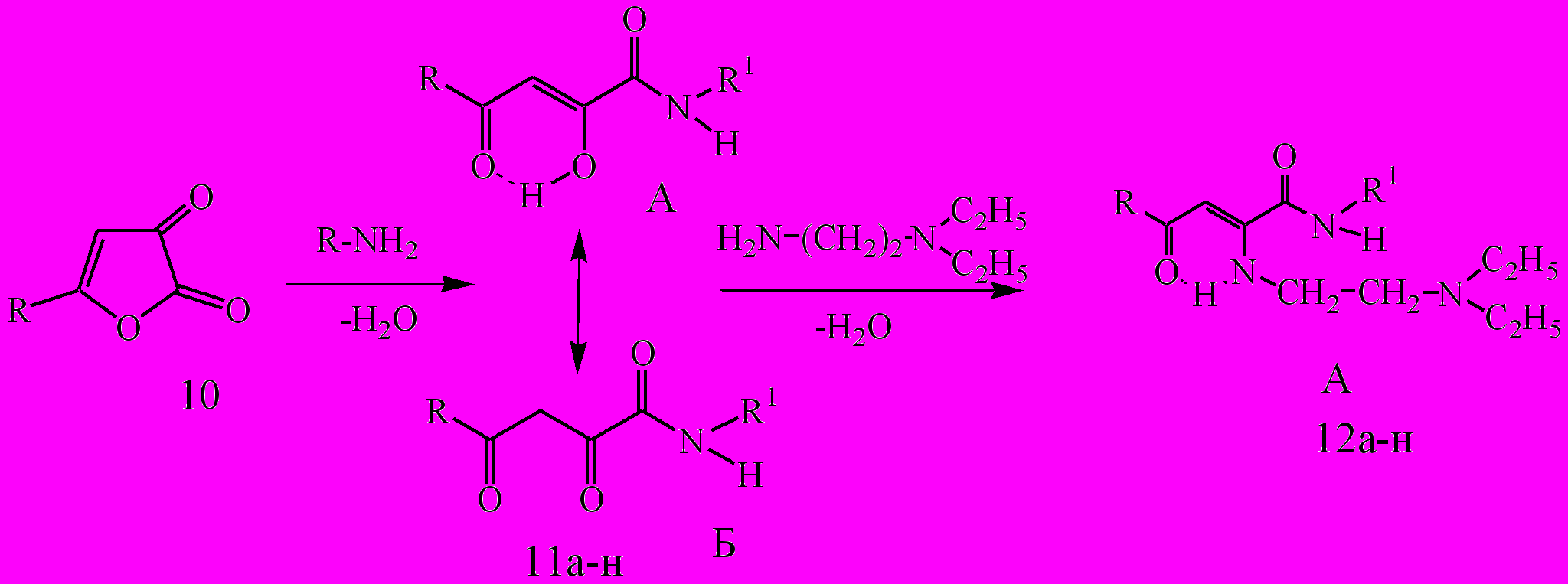 Известно, что местноанестезирующая активность современных препаратов обусловлена наличием в молекуле липофильной группы (часто в виде ароматического кольца), соединенной через промежуточную цепь (обычно включающую эфирную или амидную группу) с ионизируемой группой (как правило, третичным амином). Для оптимальной активности требуется баланс между гидрофильными и липофильными группами. В качестве матрицы для целенаправленного синтеза соединений с местноанестезирующей активностью были использованы амиды АПК (11а-н), полученные дециклизацией 5-арил-2,3-дигидрофуран-2,3-дионов (10) под действием 2,6-диметил-, 2,4,6-триметилани-линов и 4-амино-3-изопропил-5-метилфенола.