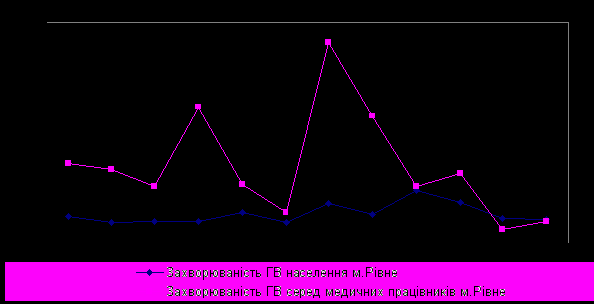 Рисунок 1. Захворюваність гепатитом В медичних працівників та населення м.Рівне.
