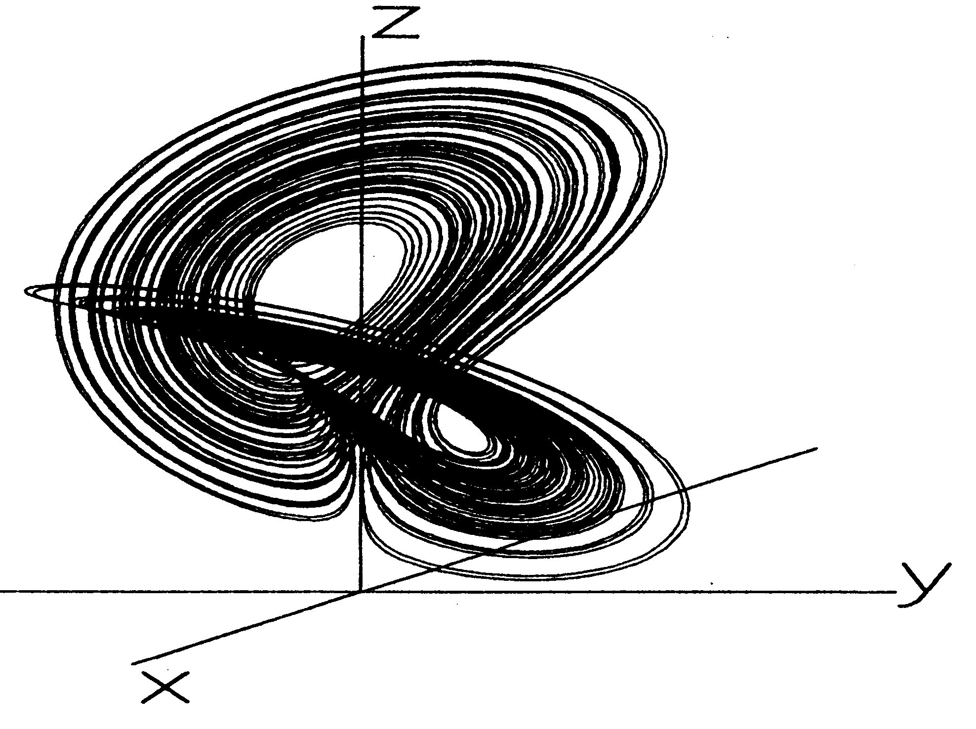 В 1963 г. метеоролог Эдвард Лоренц разработал очень простую модель погодных условий, состоящую из трёх связанных нелинейных уравнений. Однако компьютерное исследование этой модели привело к такой форме аттрактора (показанной на рис. 4.), о которой раньше нельзя было и подумать. Казалось непостижимым, что чётко детерминированные уравнения движения могут приводить к столь непредсказуемым результатам. Точка в фазовом пространстве движется как бы случайным образом, описывает несколько колебаний нарастающей амплитуды вокруг одного центра, вдруг перебрасывается к колебаниям вокруг второго центра, неожиданно возвращается и снова осциллирует вокруг первого центра и т.д.