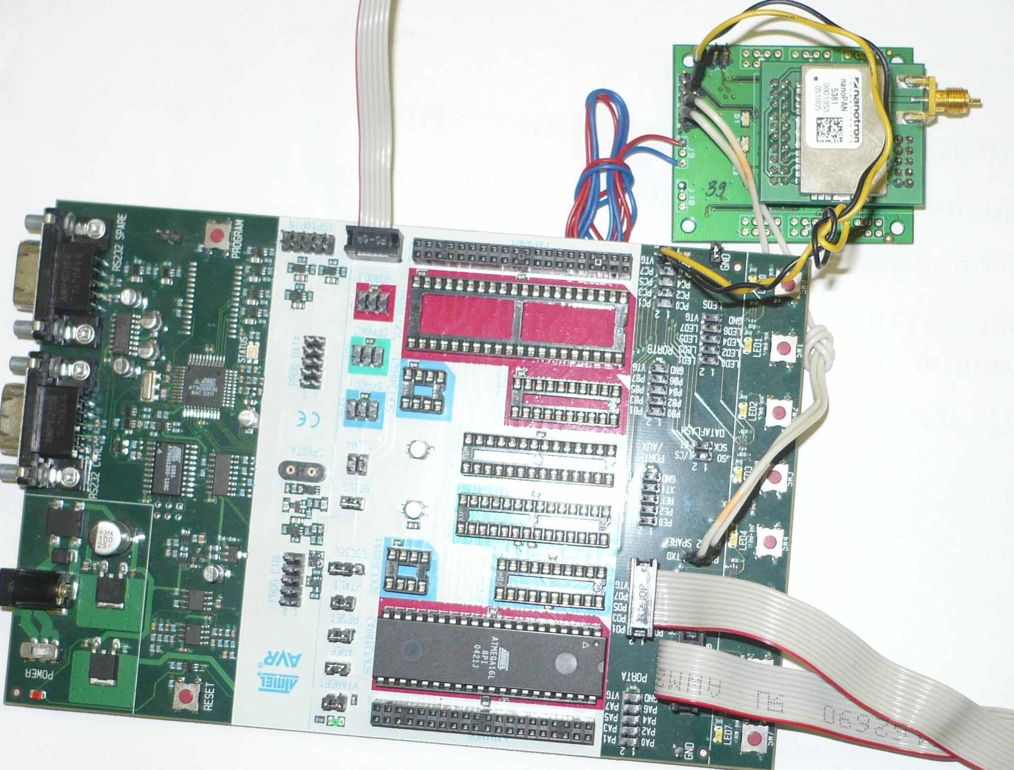 Для тестирования системы к персональному компьютеру с установленной средой разработки посредством интерфейса RS-232 был подключен программатор STK- 500 (см. рис. 3.3), к которому по SPI подключалась плата управляющего модуля. На основе бесплатного демонстрационного драйвера от фирмы Nanotron были разработаны настроечные модули программы, код программы и основной цикл, имитирующий работу системы, в контрольных точках программы были вставлены метки, сигнализирующие о ходе выполнения программы кратковременным включением светодиодов на плате. Отладочное тестирование показало работоспособность системы.