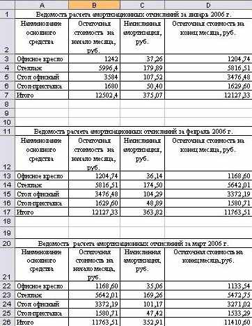 4. На рабочем листе Ведомости создать таблицу данных о начисленной амортизации по месяцам [2, с.167].