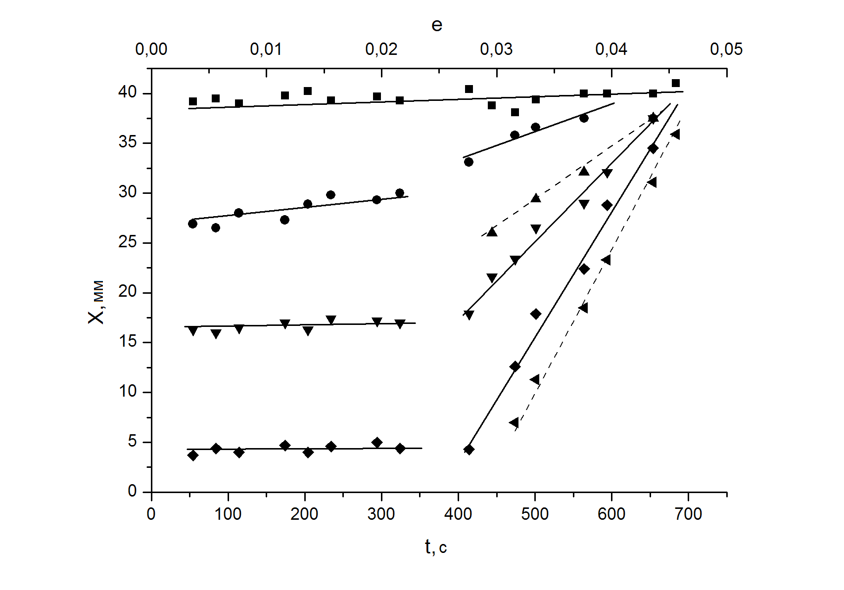 происходит разрушение. Остальные очаги локализованной пластичности перемещаются самосогласованно в направлении неподвижной высокоамплитудной зоны локализации. Чем дальше расположен очаг локализации от данной зоны, тем выше скорость его движения. Следовательно, диаграммы движения очагов деформации на стадиях предразрушения во всех материалах представляют собой пучки прямых, сходящихся в фокусе (Хf, tf), tf – время от начала деформирования.