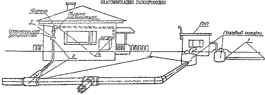 1 - распределительные газопроводы (наружные газопроводы, обеспечивающие подачу газа от источников газоснабжения до газопроводов-вводов, а также газопроводы среднего давлений, предназначенные для подачи газа к одному объекту: ГРП, котельной и т.п.);