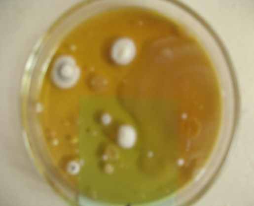 | Большие расплывчатые телесного цвета колонии (2 шт. одна лучистая) | Небольшие белые колонии ( 4 шт) | |