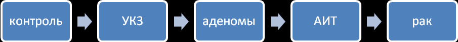 При изучении количественного накопления по всем изученным показателям, большим суммарным накоплением достоверно отличается группа злокачественных новообразований. Данные показатели несколько ниже в группе АИТ, затем следует аденомы, самые низкие значения при УКЗ. Исключением является суммарный показатель накопления химических элементов (Zспн), который в группе аденом меньше, чем при УКЗ. Следовательно, наблюдается более выраженное накопление химических элементов при более «тяжелых» формах патологии. Схематически это можно представить следующим образом (рис. 3).