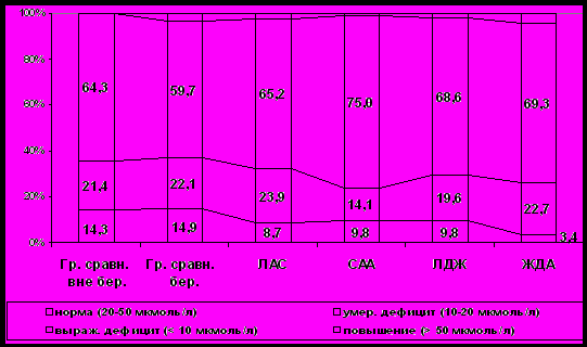 Анализ степени выраженности недостаточности йода показал, что у беременных даже в группе сравнения нормальные показатели йодидов крови (20-50 мкмоль/л) отмечались лишь в 14,9% случаев. При анемических состояниях число женщин, не имеющих отклонений со стороны йодидов крови на момент обследования, в 1,5-1,7 раза, а при ЖДА в 4,4 раза меньше. Резко выраженную йодную недостаточность до 6,31-6,95 мкмоль/л испытывали 75,0% женщин с САА и 69,3% с ЖДА.