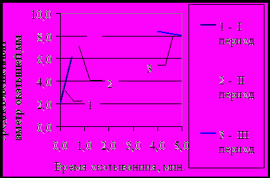 После достижения максимальных размеров в плотных гравитационных слоях происходит уплотнение сформированных окатышей, их истирание и измельчение. Когда дисперсная составляющая практически полностью отсутствует и процессы истирания превалируют над процессами роста, наступает третий период окатывания. Теоретическая зависимость средневзвешенного диаметра окатышей от времени окатывания медного концентрата с клинкером при экзотермических реакциях представлена на рисунке 2.