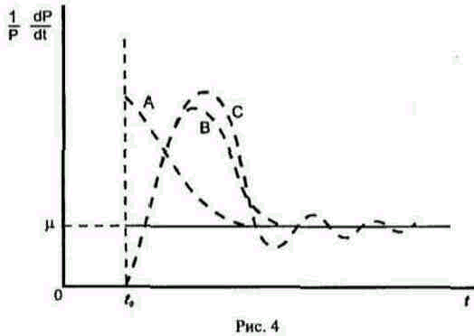 Можно кое-что сказать и о переходном процессе. Средний темп роста цен должен превышать 10% и превзойти равновесное значение, которое установится лишь в долгосрочной перспективе. При этом будут наблюдаться колебания. На рис. 4 равновесному значению соответствует сплошная горизонтальная линия, три пунктирные кривые иллюстрируют другие возможности: А - однократный перескок и постепенное возвращение на стационарный уровень, В и С - выход из начального состояния недобора темпа с последующим однократным или многократным переходом через стационарный уровень.