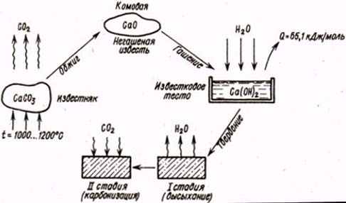 Рис. 3.1. Получение, гашение и твердение воздушной извести.