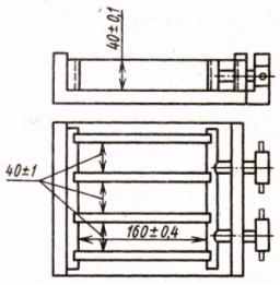 II. И з г о т о в л е н и е о б р а з ц о в. Из раствора требуемой консистенции формуют опытные образцы-балочки с помощью разъемных металлических форм (рис. 1.3), предварительно смазанных машинным маслом. Формы закрепляют на лабораторной виброплощадке, заполняют на 1 см раствором и включают виброплощадку. Заполняют все три гнезда формы раствором в 3 приема и вибрируют 3 раза по 1 минуте. После окончания формования отключают виброплощадку, форму снимают, убирают ножом излишек раствора, заглаживают поверхность образцов и маркируют их.