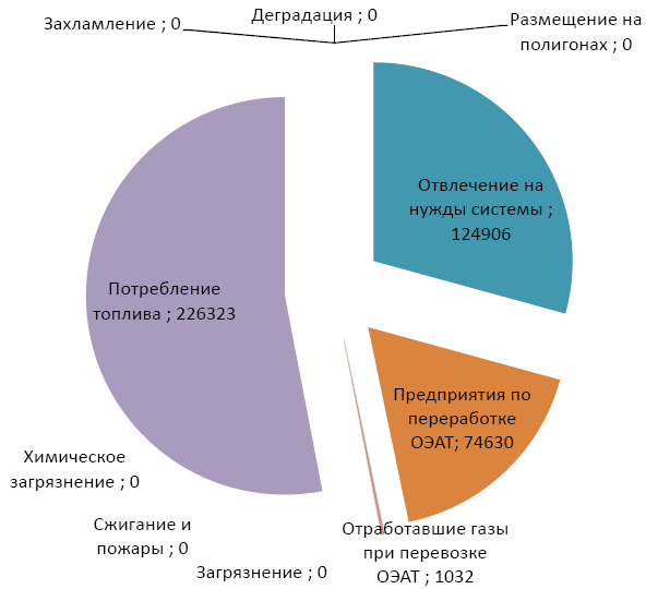 Наибольший вред наносится окружающей среде в результате химического загрязнения водных объектов – 64,6%, существенно меньше ущерб от загрязнения почв (21,7%), потребление топлива при транспортировании ОЭАТ (9,4%) и в результате отвлечения земель под стихийные свалки, предприятия, первичные площадки накопления отходов (2,8%). Остальные виды вреда являются менее значимыми (составляют менее 1% суммарного вреда). Максимальный вред окружающей среде наносят отработанные моторные масла - 79,1%. Доля отработанных аккумуляторов (свинец и электролит) в общем вреде – около 15,9%, а отработанные шины – 5,0%.