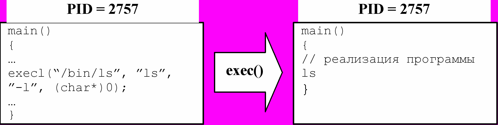 Семейство системных вызовов exec()6 производит замену тела вызывающего процесса, после чего данный процесс начинает выполнять другую программу, передавая управление на точку ее входа. Возврат к первоначальной программе происходит только в случае ошибки при обращении к exec(), т.е. если фактической замены тела процесса не произошло.