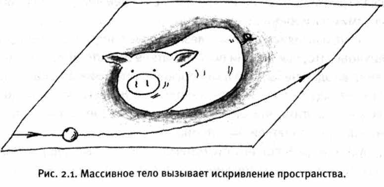 Возможно, самая замечательная черта общей теории относительности — то, как мало она требует экспериментальных предпосылок. Ключевой факт, который Эйнштейн положил в основу своей теории, — то, что движение тел под действием гравитации не зависит от их массы, — был известен уже Галилею. На этой скромной основе он построил теорию, которая мета, лежащего на горизонтально натянутом резиновом листе (рис. 2.1). Поверхность резины искривляется вблизи предмета подобно тому, как пространство-время искривляется вокруг гравитирующего тела. Если вы попробуете сыграть в бильярд на этом резиновом листе, то обнаружите, что шары отклоняются на искривленной поверхности, особенно когда проходят вблизи больших масс. Эта аналогия не идеальна: она иллюстрирует только искривление пространства, а не пространства-времени, но позволяет уловить суть идеи.