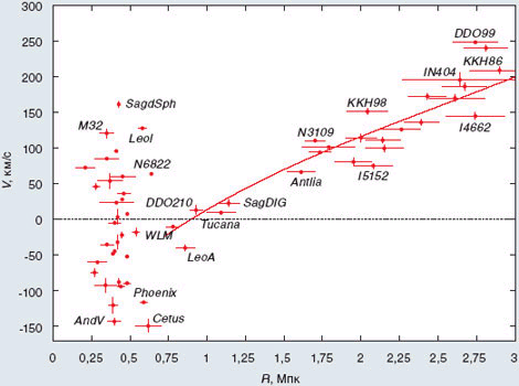 По понятным причинам самый острый интерес вызывает тот удивительный факт, что регулярный хаббловский закон разбегания галактик наблюдается в нашем ближайшем галактическом окружении на расстояниях всего в несколько Мпк. Новейшие данные о движении галактик в области экстремально малых галактических масштабов получены одним из авторов (И.Д. Караченцевым) вместе с его сотрудниками в Специальной астрофизической обсерватории Российской академии наук (САО РАН) в кооперации с астрономами США, Германии и Украины. Это результат многолетних тщательных наблюдений около 200 близких галактик, нацеленных на то, чтобы заново и максимально точно определить их скорости и расстояния до них. В работе использовался космический телескоп «Хаббл» (в общей сложности в течение почти двухсот орбитальных периодов) и Большой телескоп САО РАН. Основной вывод состоит в том, что на гораздо большем наблюдательном материале и с более высокой степенью точности, чем это было возможно до сих пор, подтверждено и продемонстрировано существование регулярного потока расширения с хаббловским законом скорости для расстояний до 8 Мпк. Особенно важно было установить, что регулярный поток разбегания галактик начинается в области около 1,5–2 Мпк от нас: начиная с этих расстояний, закон Хаббла уже уверенно прослеживается.