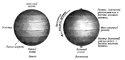Если принять условие отсутствия границ, то оказывается, что вероятность развития Вселенной но большинству возможных историй пренебрежимо мала, но существует некоторое семейство историй, значительно более вероятных, чем остальные. Эти истории можно изобразить в виде как бы поверхности Земли, причем расстояние до Северного полюса соответствует мнимому времени, а размеры окружностей, все точки которых равно удалены от Северного полюса, отвечают пространственным размерам Вселенной. Вселенная начинается как точка на Северном полюсе. При движении на юг такие широтные окружности увеличиваются, что отвечает расширению Вселенной с течением мнимого времени (рис. 8.1). Вселенная достигает максимального размера на экваторе, а затем с течением мнимого времени сжимается в точку на Южном полюсе. Несмотря на то, что на Северном и Южном полюсе размер Вселенной равен нулю, эти точки будут сингулярными не более, чем Северный и Южный полюс на поверхности Земли. Законы науки будут выполняться в них так же, как они выполняются на Северном и Южном полюсах Земли.
