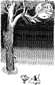 А маленький зверек закричал вместе с ним за компанию. На одной из самых высоких ветвей громадного дерева сидел мокрый и печальный муми-тролль, не спуская глаз с водной глади. Рядом с ним развевался флаг терпящего бедствие, «SOS». Папа был так удивлен и обрадован, когда господин Марабу опустился на дерево со всем его семейством, которое тут же перебралось на ветки, что утратил дар речи.