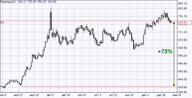 Индекс цен на зерно, по данным ФАО, в декабре 2010 г. увеличился на 40% по сравнению с декабрем 2009 г., на растительные масла - на 55%, на сахар - на 19% и на мясо - на 18%. Основной причиной для роста ФАО называет неблагоприятные погодные условия в странах-экспортерах и колебания на валютных рынках, сообщают «Ведомости». Цена на продовольственную пшеницу на мировом рынке в январе на 69% выше, чем год назад, отмечает аналитик «Ренессанс капитала» Чарльз Робертсон.