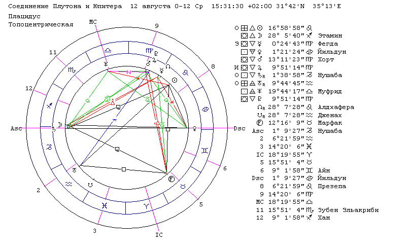 Резюме: это на текущий момент и, забегая вперёд, во всём блоке – самая информативная карта. Выявлено 11 минорных аспектов, 7 мидпоинтов (все с отличными описаниями) и 9 (!) мажорных аспектов. Отметим, что первоначально карта не охватывалась исследовательским интересом, так как, во-первых, мажорные аспекты между Юпитером и Плутоном в карте Иисуса отсутствуют, а, во-вторых, в диспозитарной цепи эти планеты также не имеют прямой связи. Тем не менее, за счет столь яркого представительства в блоке, видимо, придётся с некоторыми нарушениями расширить границы допустимого оппозиционного орбиса, и рассматривать Юпитер и Плутон как планеты, находящиеся в оппозиционных знаках – Юпитер в Овне и Плутон в Весах.