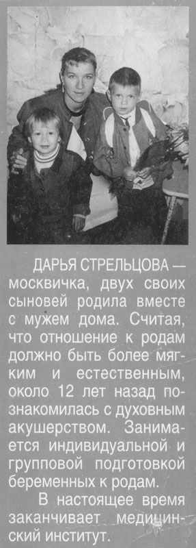 В течение всей моей работы над книгой у меня росло желание найти русского соавтора для завершения труда. Я чувствовала, что прожитых мною в России лет недостаточно. Но особых попыток разыскать такого человека я не делала, поскольку очень была увлечена работой и чувствовала, что эта встреча произойдёт сама собой. В самый подходящий для этого момент я познакомилась с Дарьей Стрельцовой. Даша заканчивает медицинский институт в Москве и уже 12 лет знакома с духовным акушерством. Её стремление совместить пользу современной медицины и интимность семейного события родов, знания и опыт дали то, чего недоставало книге. За несколько коротких месяцев была проделана очень большая совместная работа. Дашино терпение (со мной иногда нелегко работать), прилежание и трудолюбие помогли превратить книгу-мечту в книгу-реальность. Даша — настоящая духовная акушерка, принявшая роды этой книги.