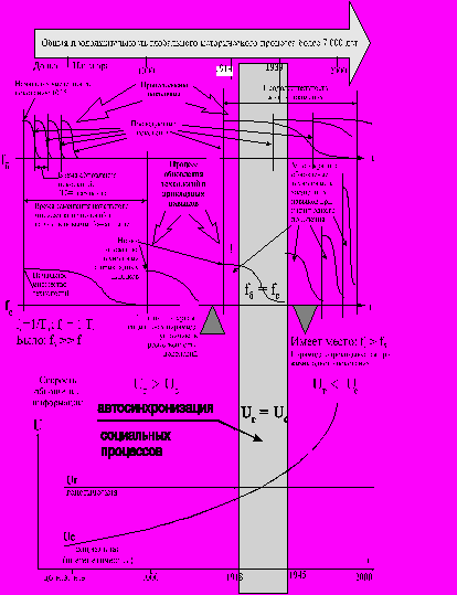 Выявленные частоты fс и fб — это меры скорости обновления информационного состояния цивилизации (как иерархически организованной системы) на социальном и биологическом уровнях в её организации. На графике (приблизительно) неизменная Uг характеризует скорость обновления генетической (индекс «г») информации в популяции; возрастающая на протяжении всей истории Uс характеризует скорость обновления культуры, как информации не передаваемой генетически от поколения к поколению.