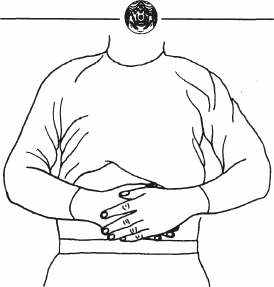 Вначале положите ладони на область пупка (рис. 8-2), причем мужчины кладут ладонь левой руки поверх правой, а женщины — наоборот.