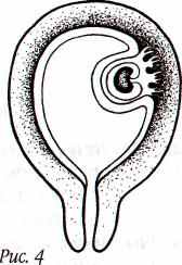 ародыш в стадии морулы в некоторых случаях может достичь полости матки и еще некоторое время блуждать в ней. Но, как правило, прежде чем попасть в матку, морула превращается в пузырек (рис. 2, 7). Пузырек, или бластула, образуется следующим образом: в плотном клеточном шаре-ягоде образуется полость — клеточная масса разделяется на зародышевый узелок и поверхностный слой клеток, окружающий этот узелок. Это превращение происходит к середине шестых — началу седьмых суток В это время зародыш состоит примерно из 107 клеток. Итак, оплодотворенное яйцо движется в матку и по мере продвижения делится и претерпевает изменения. Попав в матку в стадии бластулы (рис. 2, 7), плодное яйцо прикрепляется к стенке матки (рис. 2,8) и начинает постепенно погружаться в ее слизистую оболочку. С момента оплодотворения у вновь образованной клетки возрастает потребление кислорода, усиливается синтез белка и обмен углеводов, и поэтому к исходу 7-х суток плодное яйцо, израсходовав все свои запасы, нуждается в новом источнике питания для обеспечения дальнейшего развития. Теперь для него единственным таким источником может стать материнский организм.Внедрение плодного яйца в стенку матки называется имплантацией, которая происходит примерно на 6—7-е сутки после оплодотворения (рис. 3). Этот процесс длится 40—42 часа. При этом наружные клетки пузырька врастают, подобно корням, в слизистую оболочку матки, где быстро разрастаются и сильно ветвятся. Внутри разветвлений образуются мелкие кровеносные сосуды, которые будут питать новый организм до момента рождения (рис. 4).