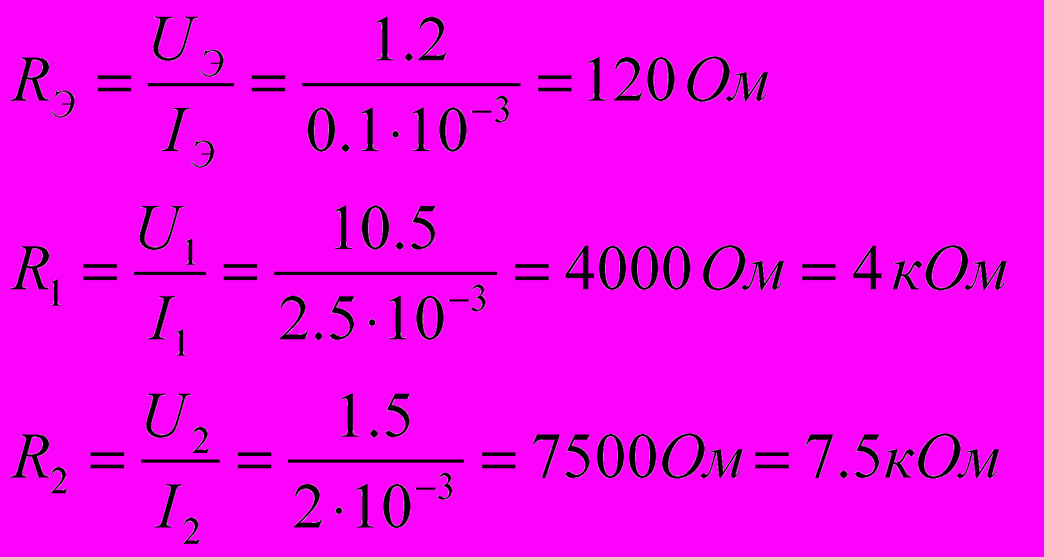 Используя закон Ома, находятся сопротивления резисторов