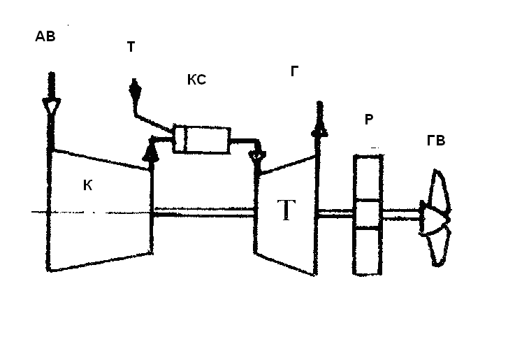 Воздух, сжатый компрессором, поступает в регенератор и нагревшись подается в камеру сгорания. Из камеры сгорания газы последовательно поступают в турбину компрессора и силовую турбину, где расширяется почти до атмосферного давления. Отработанные в турбинах газы направляются к регенератору, где отдают свою теплоту воздуху. Мощность, развиваемая турбокомпрессором, затрачивается на привод компрессора, а силовой турбины – на вращение гребного винта.
