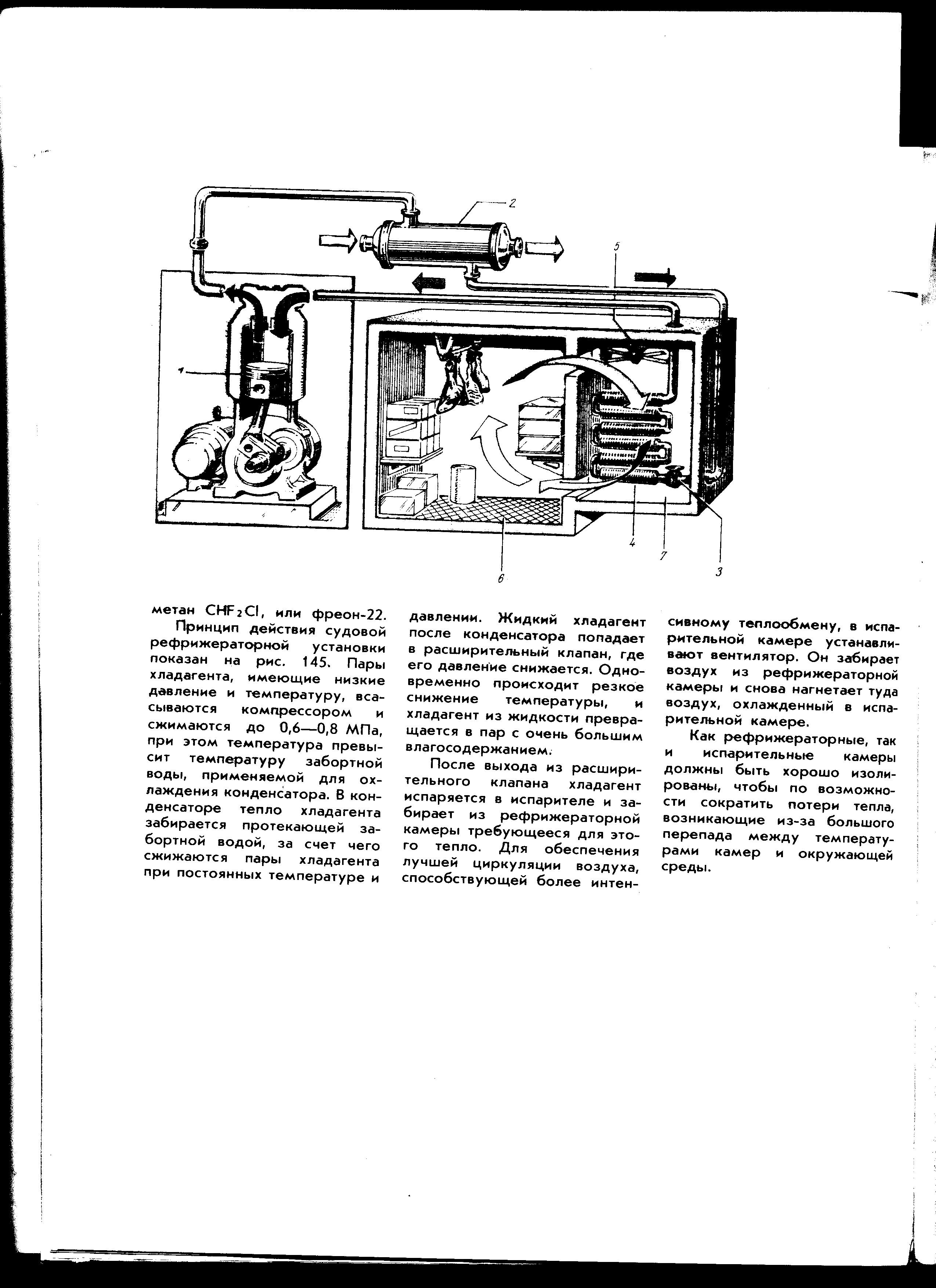 5 – вентилятор; 6 – холодильная камера; 7 – помещение испарителя.