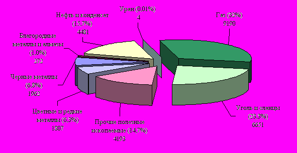 Так, в текущих балансовых запасах в мировых ценах на газ приходится 32,2%, на уголь и горючие сланцы – 23,3, на нефть – 15,7, т.е. всего по ТЭК – 71,2%, на нерудное сырье – 14,7, на черные металлы – 6,8, на цветные и редкие – 6,3 и на золото, платину, серебро и алмазы – 1%.